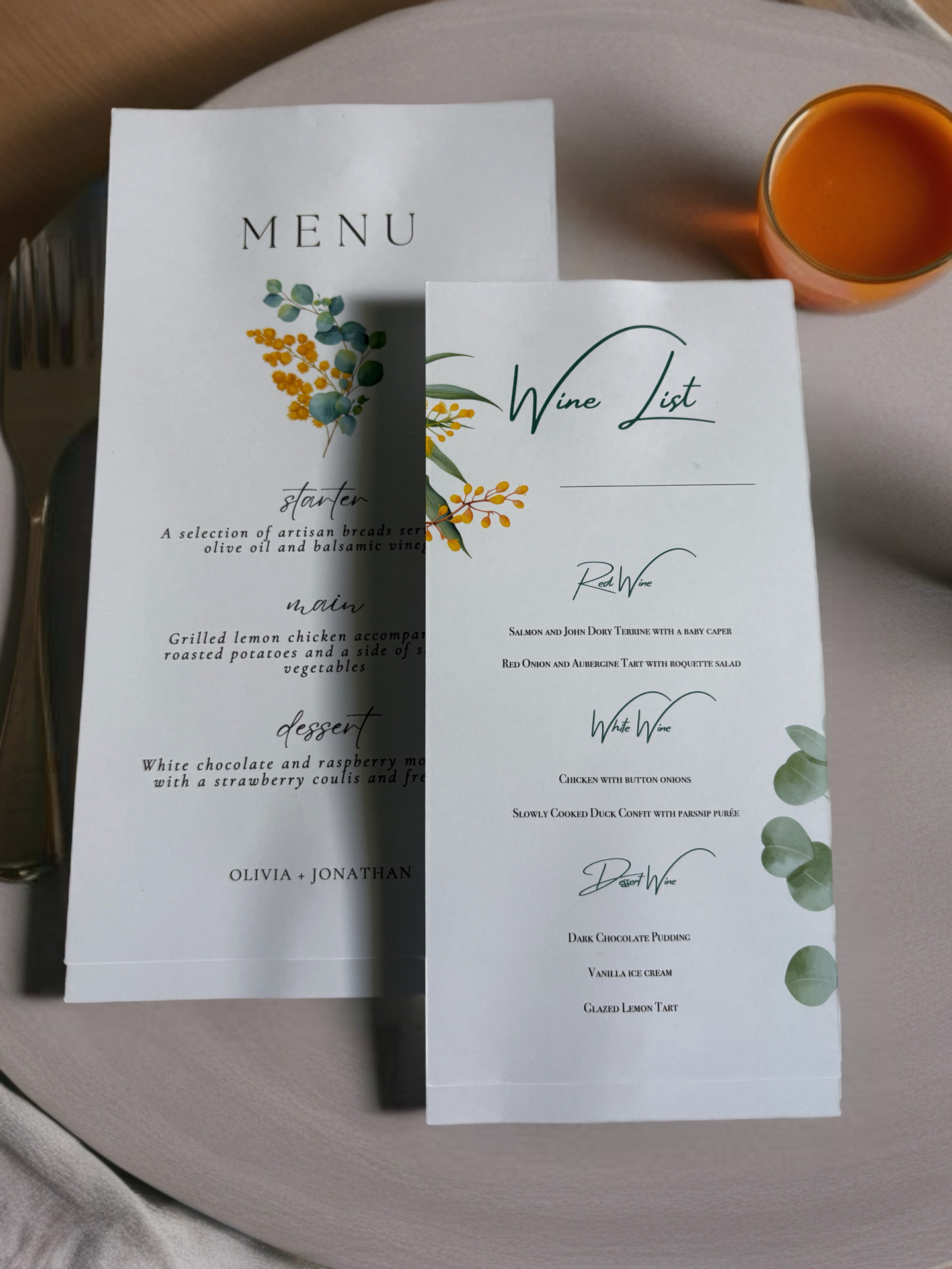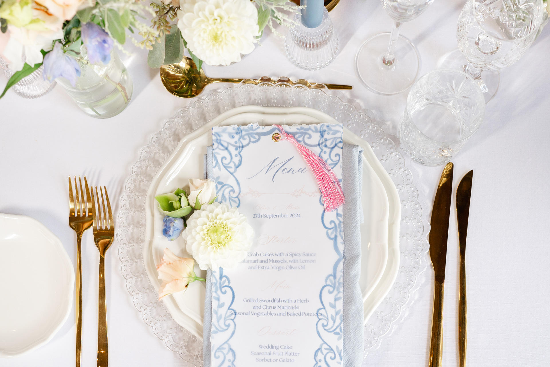 Menus are more than just a list of dishes — they’re part of the table experience. Whether printed individually for each guest or displayed on the table, our menus are tailored to your cuisine and styled to blend seamlessly with your table decor and stationery. Finished on luxurious paper with optional foiling or ribbon, they’re a tasteful way to elevate your place settings.
